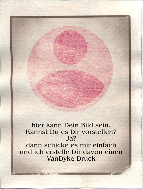 Du möchtest gerne einen VanDyke Druck von Dir oder Deinem Lieblingsmotiv, dann sende mir Dein Lieblingsfoto. Ich verwandle Deine persönlichen Motive in exquisite VanDyke Edeldrucke.